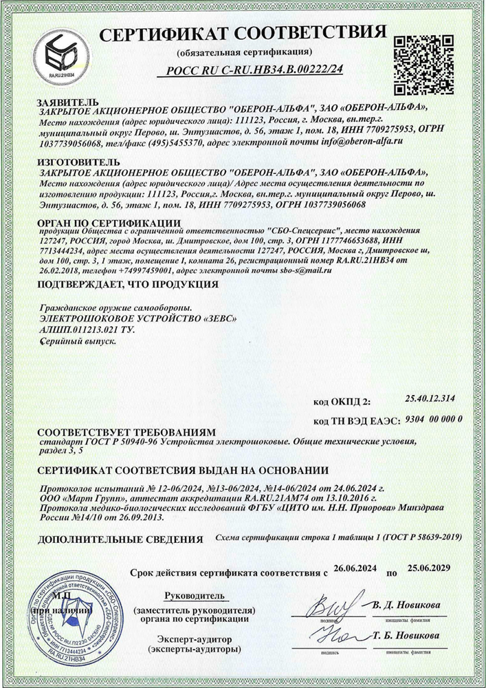 - Купить электрошокер ЗЕВС - это значит приобрести настоящее сертифицированное электрошоковое оружие с правильной конструкцией, брендовыми комплектующими, ответственной сборкой, 100% контролем готовых изделий.