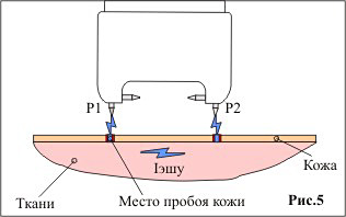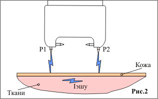 Если Lк > Lр1*k+Lp2, то разряд начинает протекать не с контрольного электрода на контрольный, а течет с рабочего электрода Р1 на электропроводные биологические ткани объекта и замыкается на электроде Р2 (рис.2).