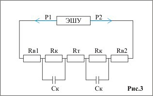 Для того, чтобы полноценно рассмотреть параметры импульса, нужно дополнительно рассмотреть эквивалентную электрическую схему воздействия ЭШУ на биологический объект. В наиболее общем случае ток с электрода Р1 на Р2 проходит через воздушный зазор, кожу, ткани. Далее опять через кожу и воздушный зазор (рис.2). Все эти элементы имеют свое электрическое сопротивление и эквивалентная схема представлена на рис.3.