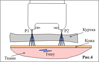 Результат: Высоковольтная развязка ЭШУ нагружается на большое сопротивление R: сопротивление на одежде, только частично поляризованный воздушный канал (разряд разваливается и не способен поляризовать и этим значительно снизить сопротивление воздушного канала). Кроме того разряд с электрода Р1 попадает на кожу объекта в разных точках зоны поражения (рис.4) и сопротивление кожи велико для каждого импульса. В результате система «воздух-кожа-ткани» получает удар высоким напряжением. Вследствие того, что мощность импульса электрошокера ограничена общей энергетикой элемента питания, то соответственно снижается средний ток импульса. Если в процессе воздействия Rв снизится (например, одежда подгорит в пути прохождения тока), то ток увеличится.