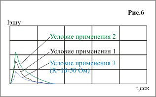 При сертификации электрошокеров электрические параметры импульса контролируются следующим образом: высоковольтная развязка замыкается на сопротивление R=1кОм и замеряется напряжение (ток) на этой нагрузке, форма импульса и его длительность. Эти данные вкупе с частотой образования импульсов позволяют рассчитать мощность ЭШУ. Ни о каких приведенных выше различных условиях применения речь не идет. Это позволяет выходить на рынок электрошокерам, которые не имеют права считаться оружием. У таких электрошокеров полный обман по электрическим параметрам: на R=1кОм амплитуда импульса как правило не оптимизирована по отношению к его длительности. Что это означает на практике. Через толстую одежду разряд не эффективен, а при плотном контакте электродов с зоной поражения бесполезен. А если человек обладает от природы низким сопротивлением или находится в алкогольном или наркоточеском опъянении (Rт=10 Ом), высоковольтная развязка «проседает», средний ток импульса резко падает и такой разряд объект практически не чувствует (рис. 6).