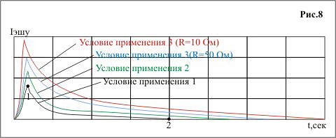 Плавающий импульс электрошокового устройства – значительно изменяемая длительность импульса в зависимости от условий применения электрошокера. При воздействии на человека в состоянии алкогольного или наркотического опъянения, а так же на лиц с врожденным низким сопротивлением, сопротивление кожи и подкожных тканей очень низкое. Высоковольтная развязка чрезвычайно чувствительна к подключаемой к ней нагрузке и длительность импульса в этом случае вырастает. Это значит, что объект более длительное время будет находиться непосредственно под напряжением, и эффективность воздействия ЭШУ значительно увеличится (рис.8).