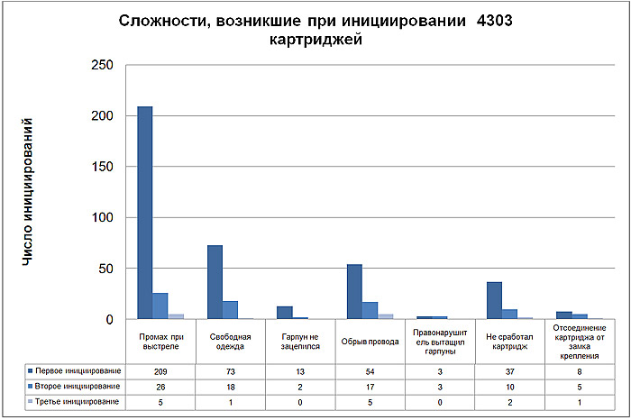 Во время исследования эффективности ЭШУ было обращено внимание на метод кодирования, так как это предмет противоречий. Для целей этого исследования инициирование ЭШУ считалось эффективным, если после пятисекундного применения объект полностью подчинялся. Следует уточнить, что в данном исследовании инициирование ЭШУ – это единичное применение ЭШУ (которое производится нажатием на курок и выстрелом гарпунов; контактное применение, описанное ниже, также принимается за единичное применение) (рис. 3.3).